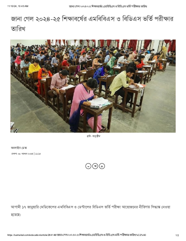 জানা গেল ২০২৪-২৫ শিক্ষাবর্ষের এমবিবিএস ও বিডিএস ভর্তি পরীক্ষার তারিখ.pdf Published on 08 November 2024 Newspaper দৈনিক সমকাল Category Professional Education Professional Education Medical Download