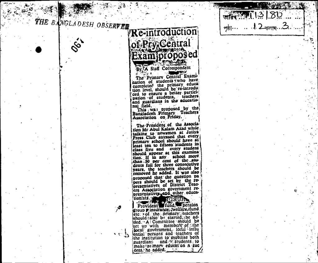 Re introducation of pry central exam prosposed Published on Newspaper The Bangladesh Observer Category General Education Download