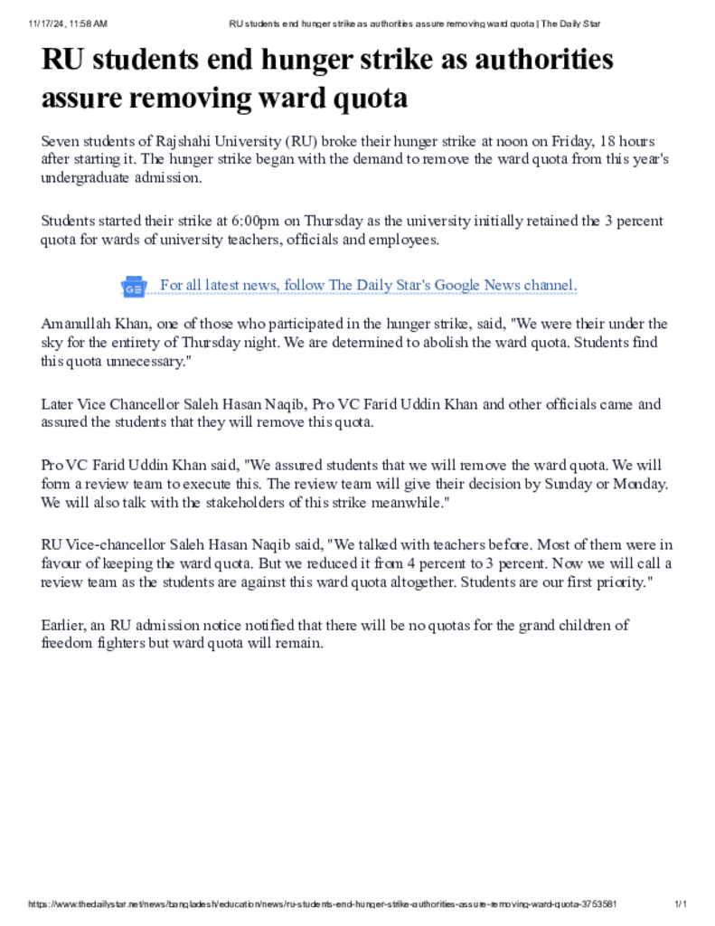 RU students end hunger strike as authorities assure removing ward quota _ The Daily Star.pdf Published on 15 November 2024 Newspaper The Daily Star Category Admission / Seat Problem General Education Download