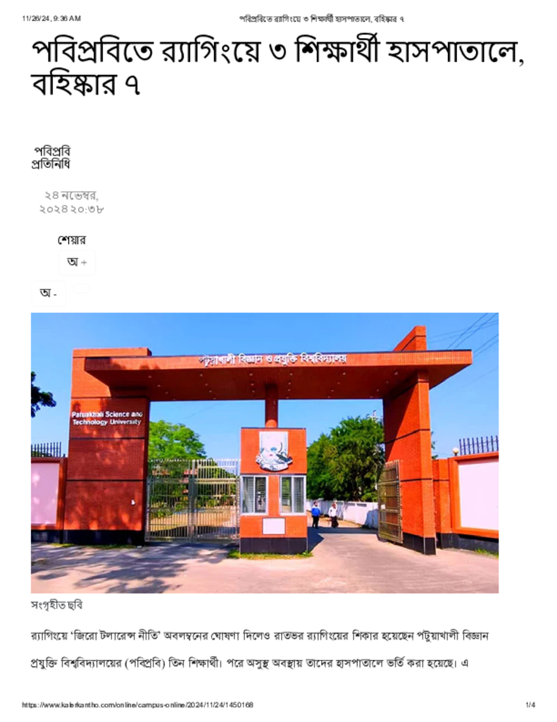 পবিপ্রবিতে র_্যাগিংয়ে ৩ শিক্ষার্থী হাসপাতালে, বহিষ্কার ৭.pdf Published on 24 November 2024 Newspaper দৈনিক কালের কন্ঠ Category Professional Education General Education Download