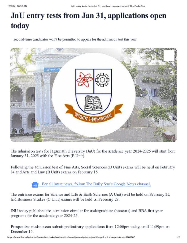 JnU entry tests from Jan 31, applications open today _ The Daily Star.pdf Published on 01 December 2024 Newspaper The Daily Star Category Admission / Seat Problem General Education Download