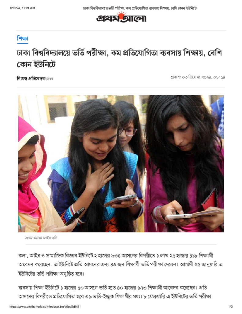 ঢাকা বিশ্ববিদ্যালয়ে ভর্তি পরীক্ষা, কম প্রতিযোগিতা ব্যবসায় শিক্ষায়, বেশি কোন ইউনিটে.pdf Published on 03 December 2024 Newspaper দৈনিক প্রথম আলো Category Admission / Seat Problem General Education Higher Education Public Download