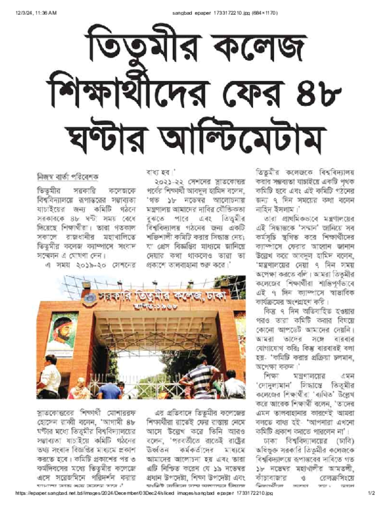 তিতুমীর কলেজ শিক্ষার্থীদের ফের ৪৮ ঘন্টার আল্টিমেটাম.pdf Published on 03 December 2024 Newspaper দৈনিক সংবাদ Category General Education General Education Higher Education Public Download