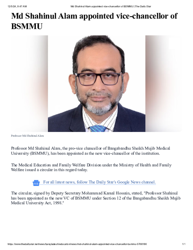 Md Shahinul Alam appointed vice-chancellor of BSMMU _ The Daily Star.pdf Published on 05 December 2024 Newspaper The Daily Star Category Professional Education Professional Education Medical Download