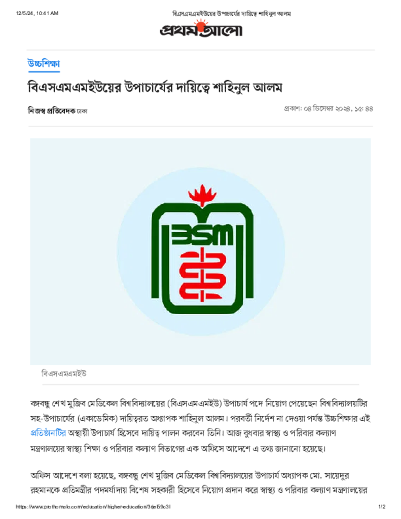 বিএসএমএমইউয়ের উপাচার্যের দায়িত্বে শাহিনুল আলম.pdf Published on 05 December 2024 Newspaper দৈনিক প্রথম আলো Category Professional Education Professional Education Medical Download