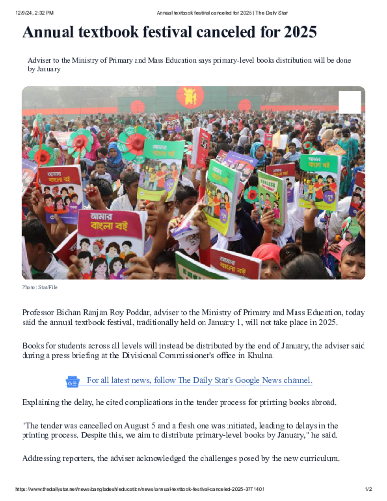 Annual textbook festival canceled for 2025 _ The Daily Star.pdf Published on 09 December 2024 Newspaper The Daily Star Category Educational Ministry / Departments Download