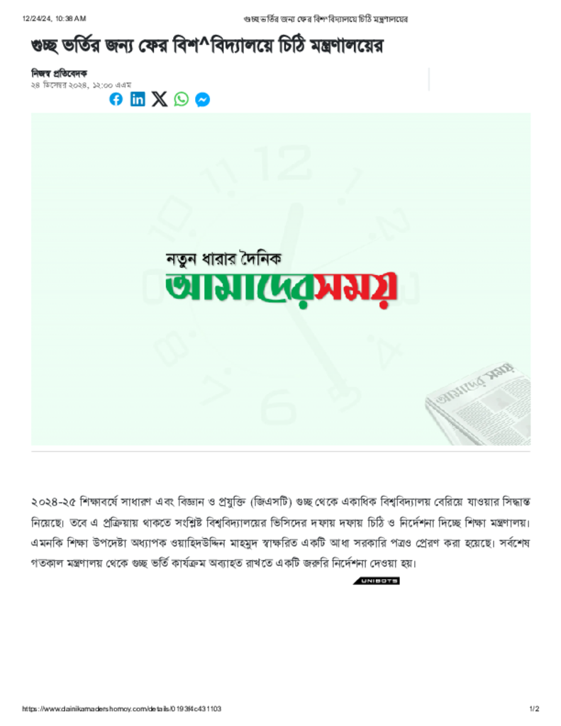 গুচ্ছ ভর্তির জন্য ফের বিশ^বিদ্যালয়ে চিঠি মন্ত্রণালয়ের.pdf Published on 24 December 2024 Newspaper দৈনিক আমাদের সময় Category Educational Ministry / Departments General Education Higher Education Public Download