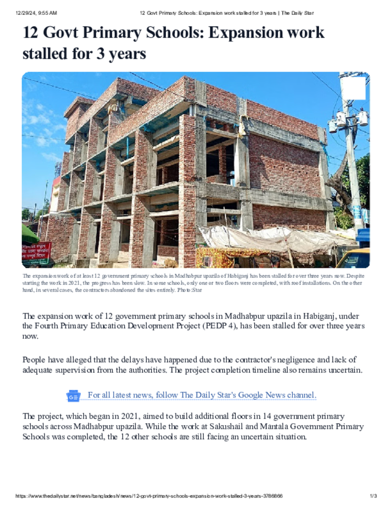 12 Govt Primary Schools_ Expansion work stalled for 3 years _ The Daily Star.pdf Published on 29 December 2024 Newspaper The Daily Star Category General Education General Education Download