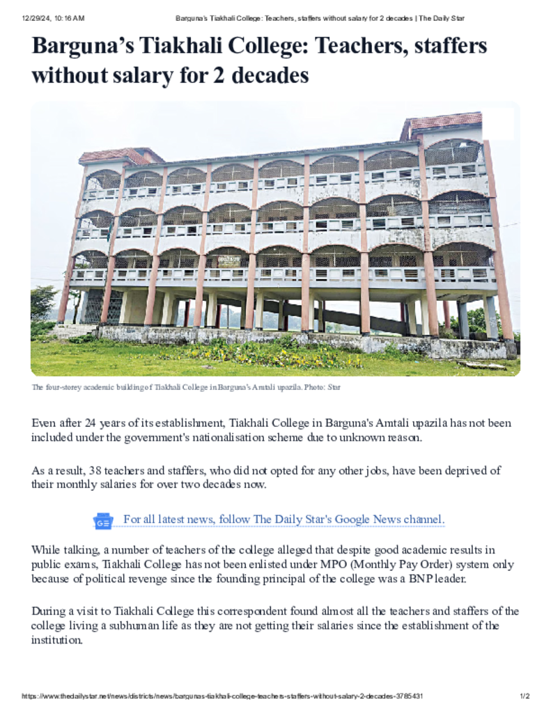 Barguna’s Tiakhali College_ Teachers, staffers without salary for 2 decades.pdf Published on 27 December 2024 Newspaper The Daily Star Category Others Download