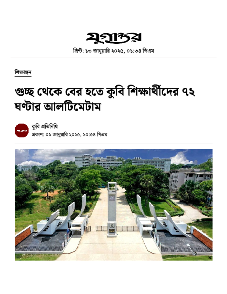 গুচ্ছ থেকে বের হতে কুবি শিক্ষার্থীদের ৭২ ঘণ্টার আলটিমেটাম.pdf Published on 09 January 2025 Newspaper দৈনিক যুগান্তর Category Admission / Seat Problem General Education Higher Education Public Download