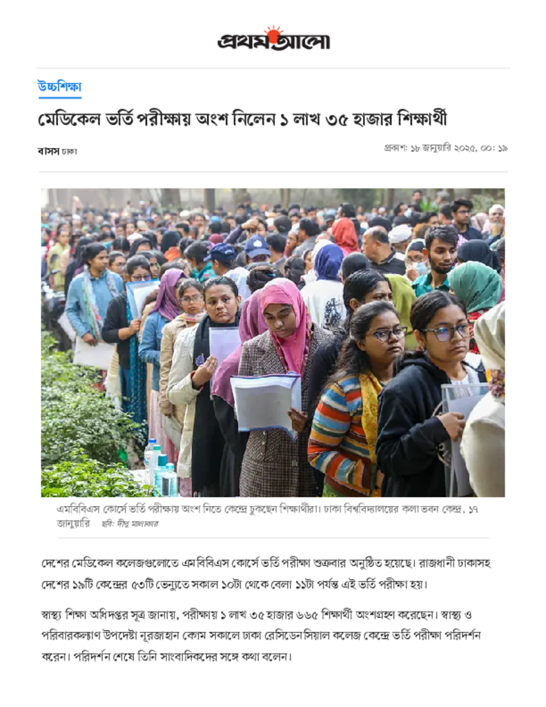 মেডিকেল ভর্তি পরীক্ষায় অংশ নিলেন ১ লাখ ৩৫ হাজার শিক্ষার্থী.pdf Published on 18 January 2025 Newspaper দৈনিক প্রথম আলো Category Professional Education Professional Education Medical Download