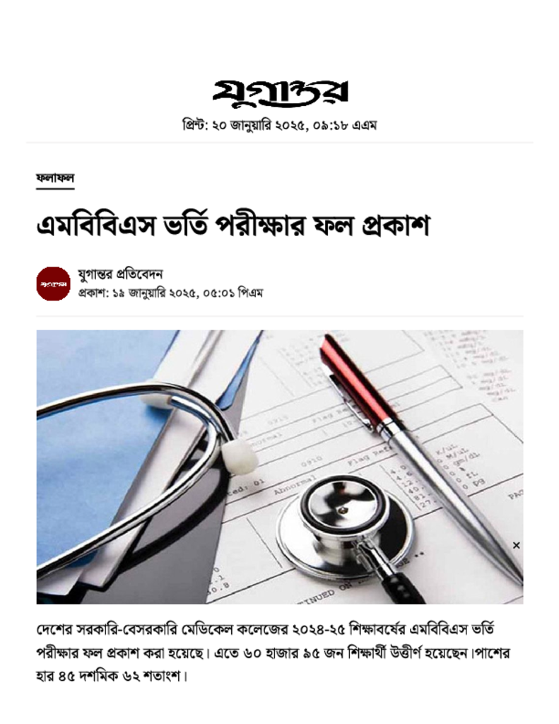 এমবিবিএস ভর্তি পরীক্ষার ফল প্রকাশ.pdf Published on 19 January 2025 Newspaper দৈনিক যুগান্তর Category Professional Education Professional Education Medical Download