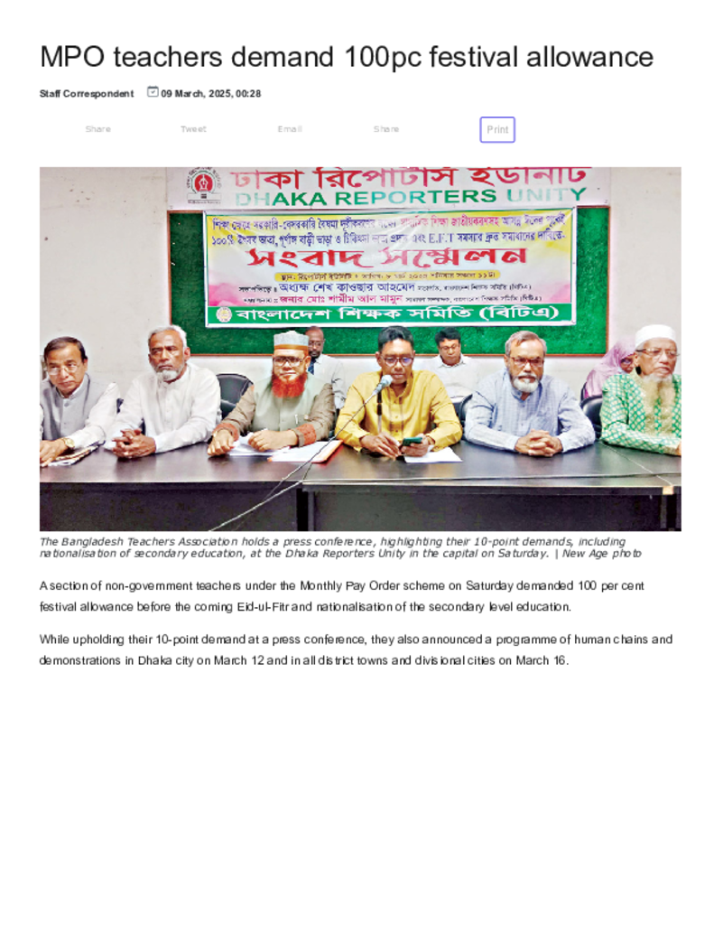 New Age _ MPO teachers demand 100pc festival allowance.pdf Published on 09 March 2025 Newspaper New Age Category Educational Ministry / Departments Download
