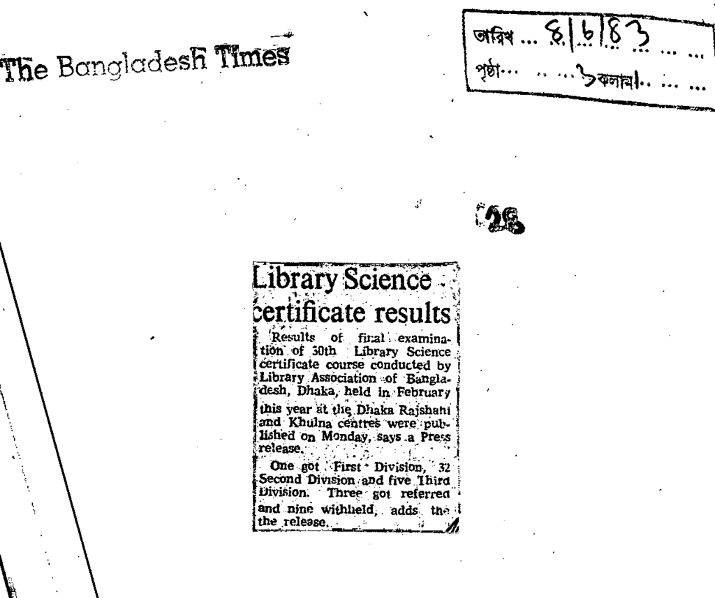 Libray Science certificate results Published on Newspaper The Bangladesh Times Category Admission / Seat Problem Download