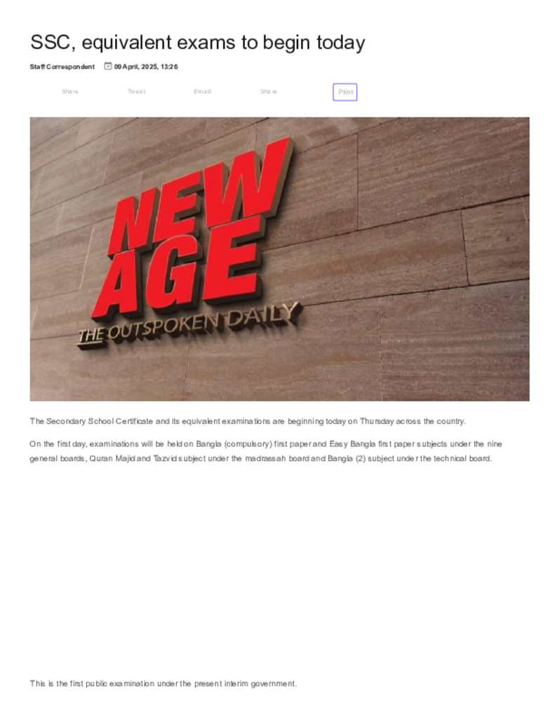 New Age _ SSC, equivalent exams to begin today.pdf Published on 09 April 2025 Newspaper New Age Category Public Examination Public Examination SSC Download