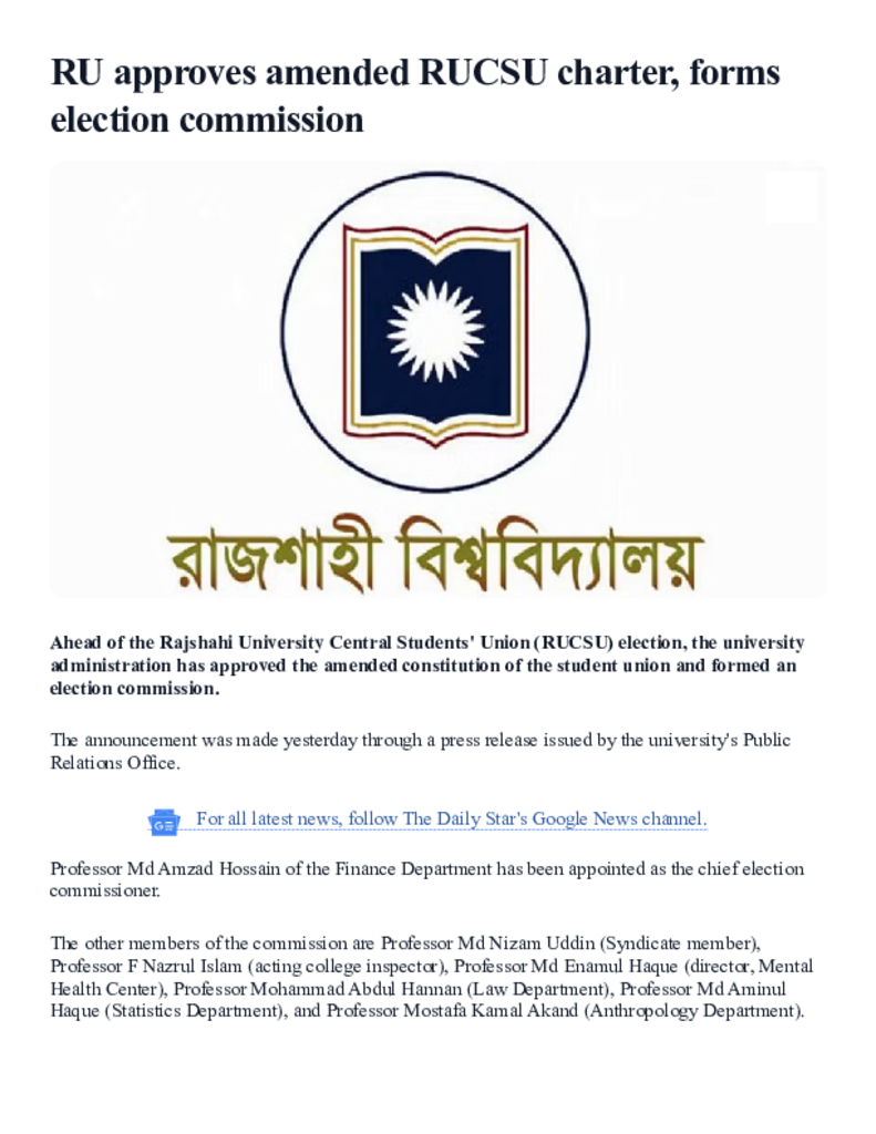 RU approves amended RUCSU charter, forms election commission.pdf Published on 17 April 2025 Newspaper The Daily Star Category Student Politics General Education Download