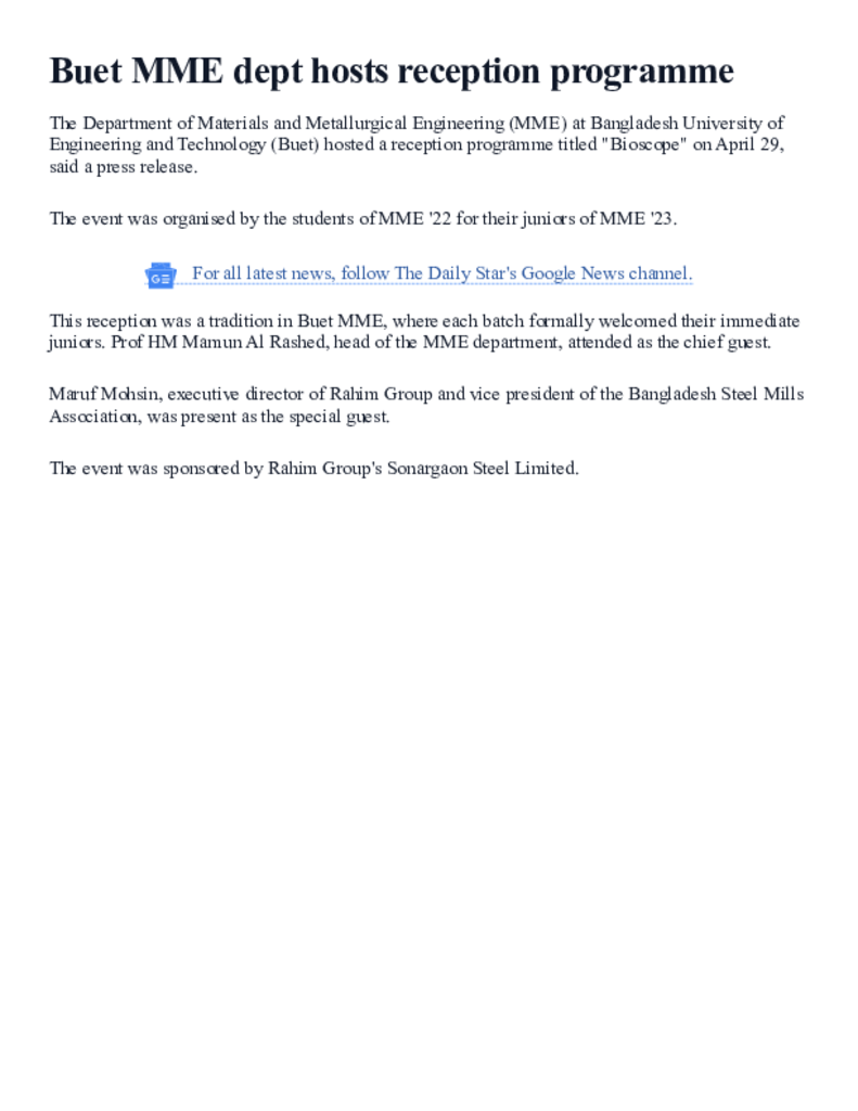 Buet MME dept hosts reception programme _ The Daily Star.pdf Published on 04 May 2025 Newspaper The Daily Star Category Professional Education Professional Education Engineering Download
