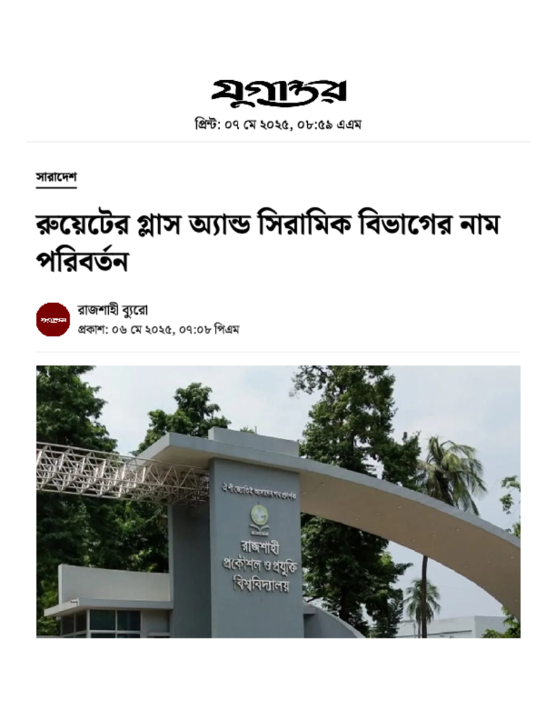 রুয়েটের গ্লাস অ্যান্ড সিরামিক বিভাগের নাম পরিবর্তন.pdf Published on 06 May 2025 Newspaper দৈনিক যুগান্তর Category Professional Education General Education Download