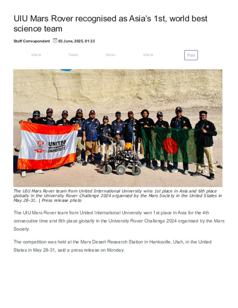 New Age _ UIU Mars Rover recognised as Asia’s 1st, world best science team.pdf Published on 03 June 2025 Newspaper New Age Category Science Education General Education Higher Education Private Download