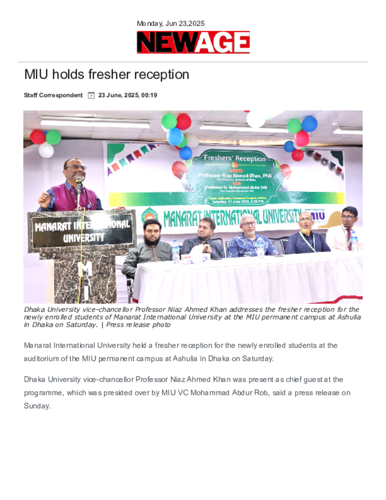 New Age _ MIU holds fresher reception.pdf Published on 23 June 2025 Newspaper New Age Category Admission / Seat Problem General Education Download