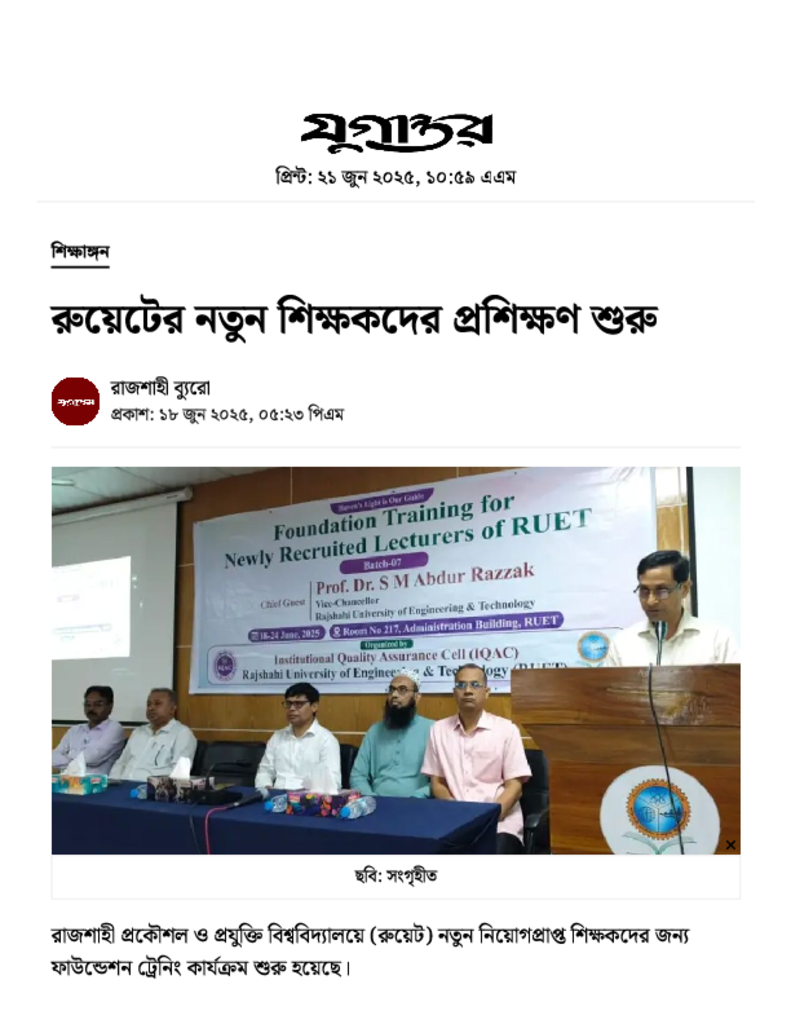 রুয়েটের নতুন শিক্ষকদের প্রশিক্ষণ শুরু.pdf Published on 18 June 2025 Newspaper দৈনিক যুগান্তর Category Professional Education General Education Professional Education Engineering Download