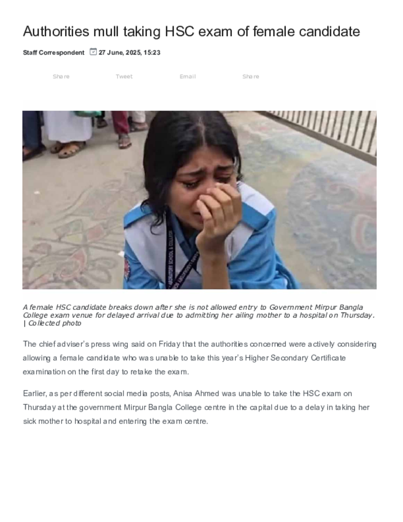 New Age _ Authorities mull taking HSC exam of female candidate.pdf Published on 27 June 2025 Newspaper New Age Category Personal Opinion / Discussion / Commentary Public Examination HSC Download
