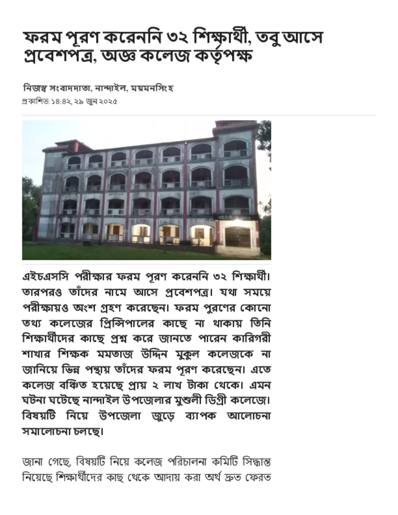ফরম পূরণ করেননি ৩২ শিক্ষার্থী, তবু আসে প্রবেশপত্র, অজ্ঞ কলেজ কর্তৃপক্ষ.pdf Published on 29 June 2025 Newspaper দৈনিক জনকণ্ঠ Category Public Examination Public Examination HSC Download