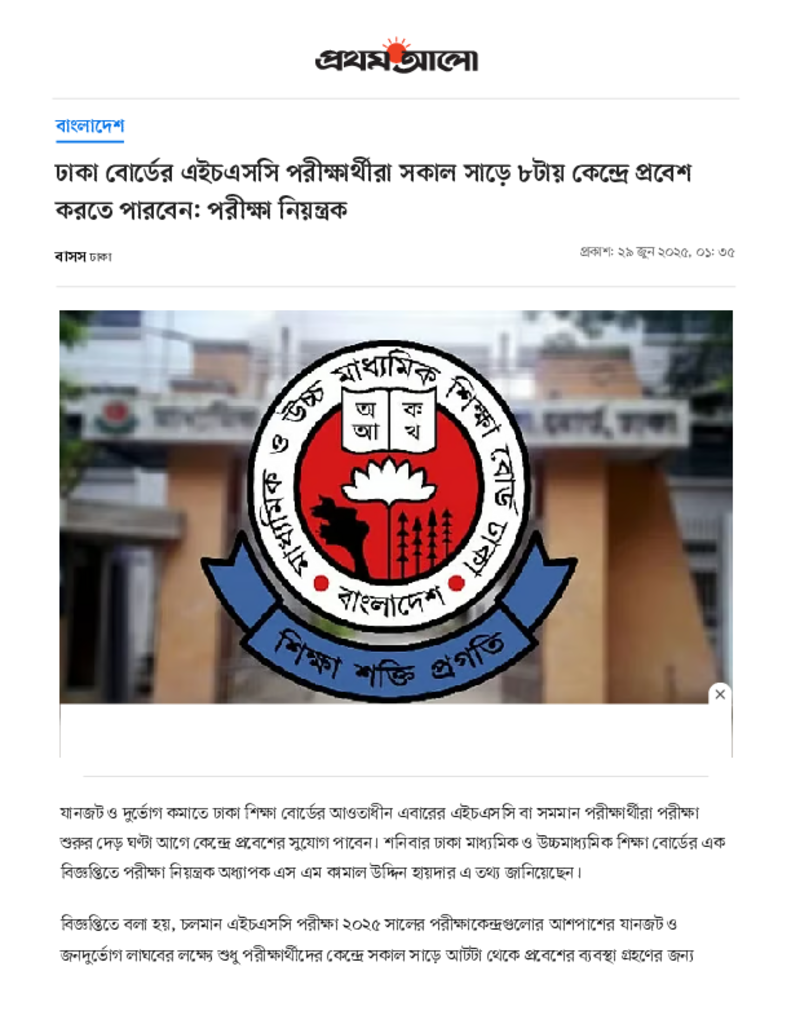 ঢাকা বোর্ডের এইচএসসি পরীক্ষার্থীরা সকাল সাড়ে ৮টায় কেন্দ্রে প্রবেশ করতে পারবেন.pdf Published on 29 June 2025 Newspaper দৈনিক প্রথম আলো Category Public Examination Public Examination HSC Download
