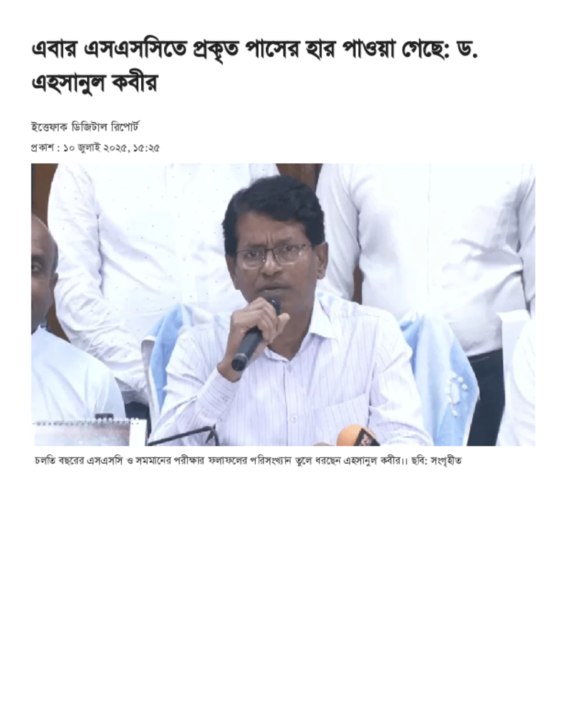 এবার এসএসসিতে প্রকৃত পাসের হার পাওয়া গেছে_ ড. এহসানুল কবীর.pdf Published on 10 July 2025 Newspaper দৈনিক ইত্তেফাক Category Public Examination Public Examination SSC Download