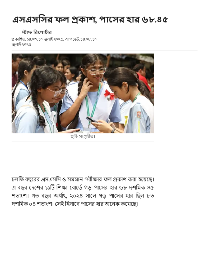 এসএসসির ফল প্রকাশ, পাসের হার ৬৮.৪৫.pdf Published on 10 July 2025 Newspaper দৈনিক জনকণ্ঠ Category Public Examination Public Examination SSC Download