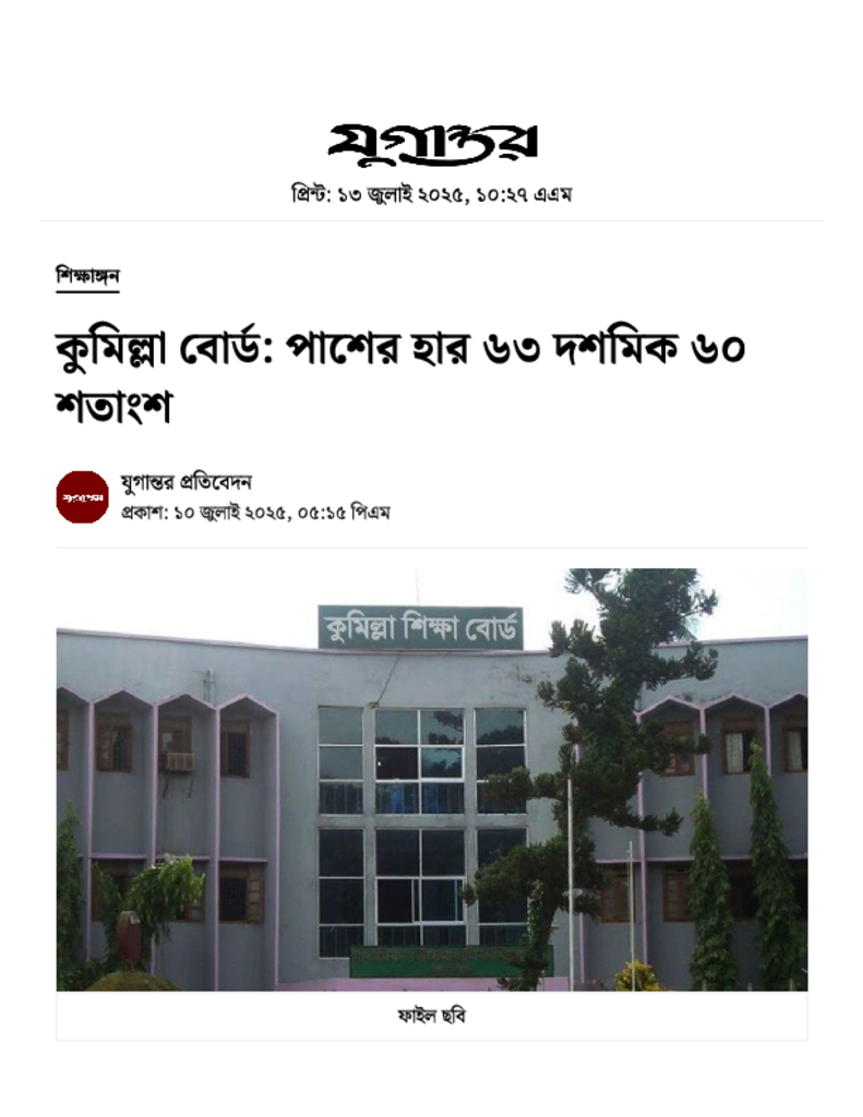 কুমিল্লা বোর্ড_ পাশের হার ৬৩ দশমিক ৬০ শতাংশ.pdf Published on 10 July 2025 Newspaper দৈনিক যুগান্তর Category Public Examination Public Examination SSC Download