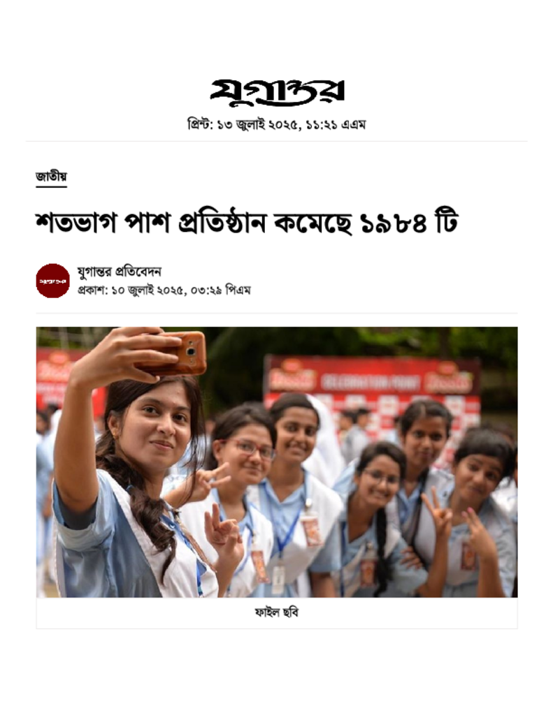 শতভাগ পাশ প্রতিষ্ঠান কমেছে ১৯৮৪ টি.pdf Published on 10 July 2025 Newspaper দৈনিক যুগান্তর Category Public Examination Public Examination SSC Download