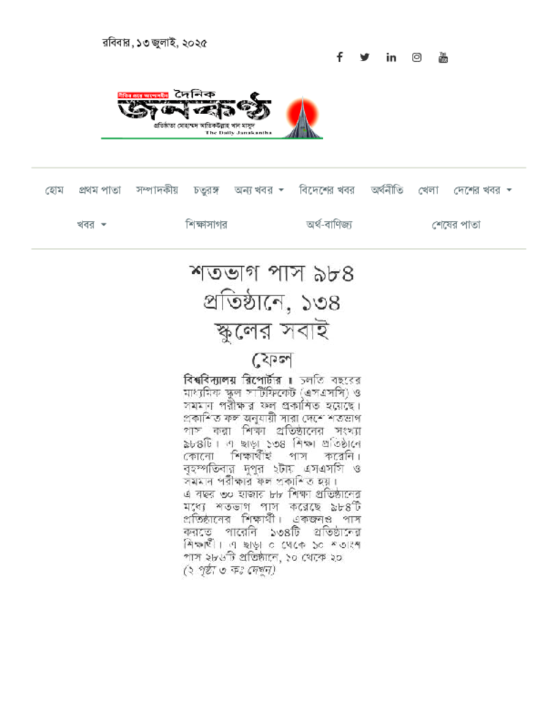 শতভাগ পাস ৯৮৪ প্রতিষ্ঠানে, ১৩৪ স্কুলের সবাই ফেল.pdf Published on 11 July 2025 Newspaper দৈনিক জনকণ্ঠ Category Public Examination Public Examination SSC Download