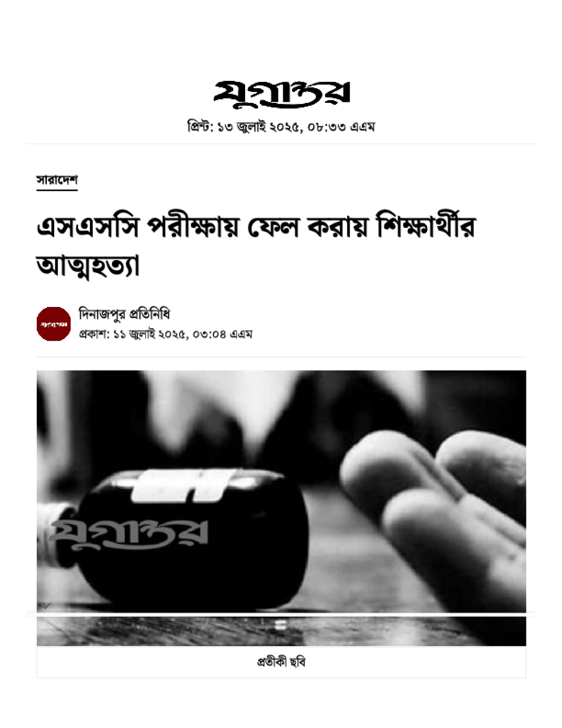 এসএসসি পরীক্ষায় ফেল করায় শিক্ষার্থীর আত্মহত্যা.pdf Published on 11 July 2025 Newspaper দৈনিক যুগান্তর Category Personal Opinion / Discussion / Commentary Public Examination SSC Download