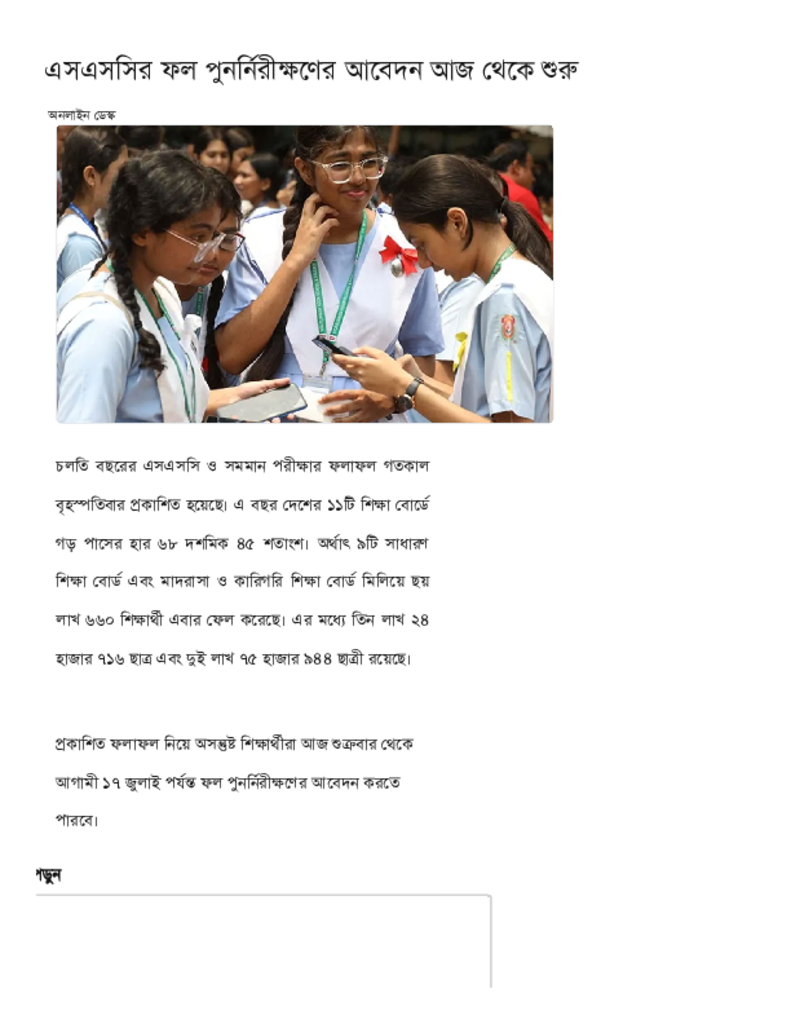 এসএসসির ফল পুনর্নিরীক্ষণের আবেদন আজ থেকে শুরু.pdf Published on 11 July 2025 Newspaper দৈনিক কালের কন্ঠ Category Public Examination Public Examination SSC Download