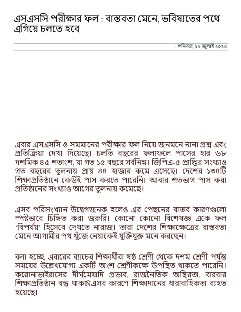 এসএসসি পরীক্ষার ফল _ বাস্তবতা মেনে, ভবিষ্যতের পথে এগিয়ে চলতে হবে _ সংবাদ অনলাইন.pdf Published on 12 July 2025 Newspaper দৈনিক সংবাদ Category Personal Opinion / Discussion / Commentary Public Examination SSC Download