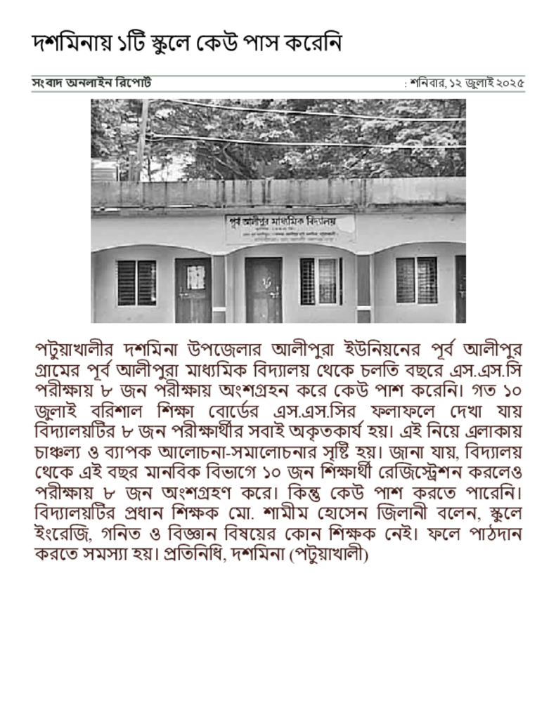 দশমিনায় ১টি স্কুলে কেউ পাস করেনি _ সংবাদ অনলাইন.pdf Published on 12 July 2025 Newspaper দৈনিক সংবাদ Category Public Examination Public Examination SSC Download