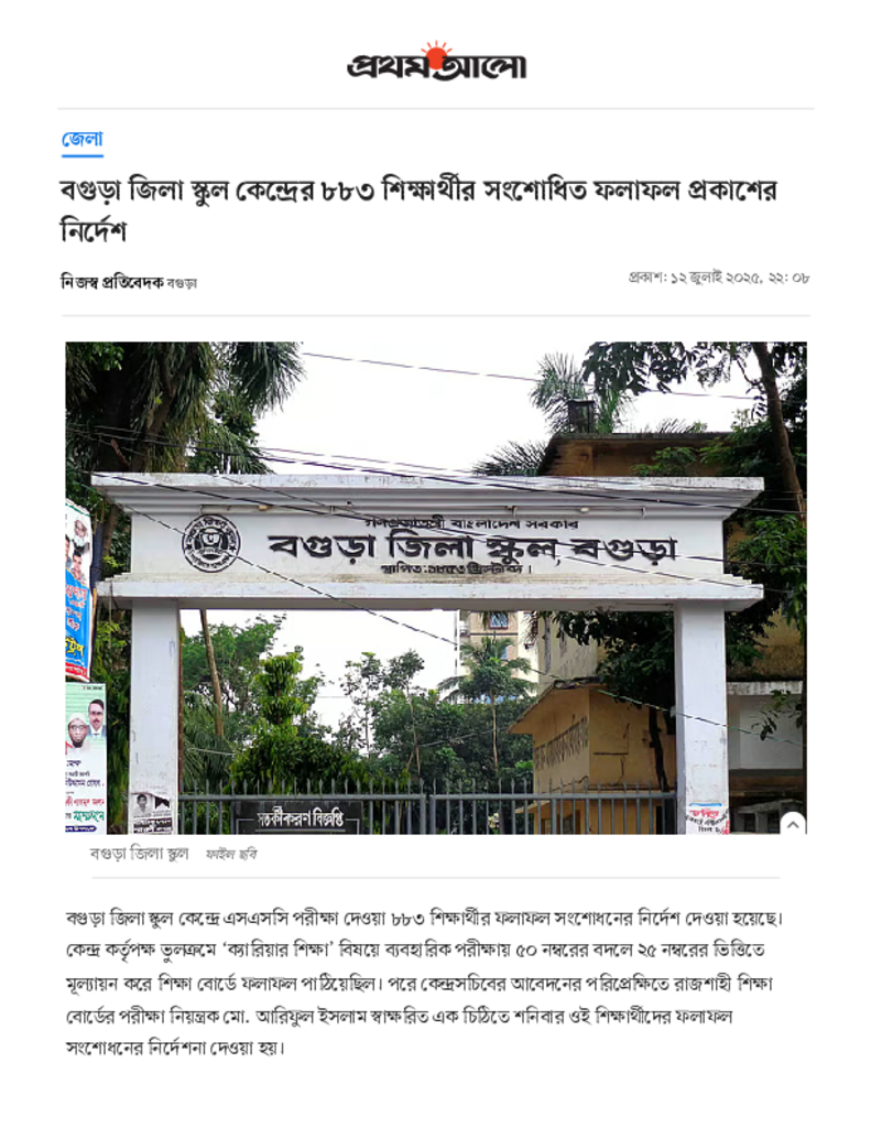 বগুড়া জিলা স্কুল কেন্দ্রের ৮৮৩ শিক্ষার্থীর সংশোধিত ফলাফল প্রকাশের নির্দেশ.pdf Published on 12 July 2025 Newspaper দৈনিক প্রথম আলো Category Educational Ministry / Departments Public Examination SSC Download