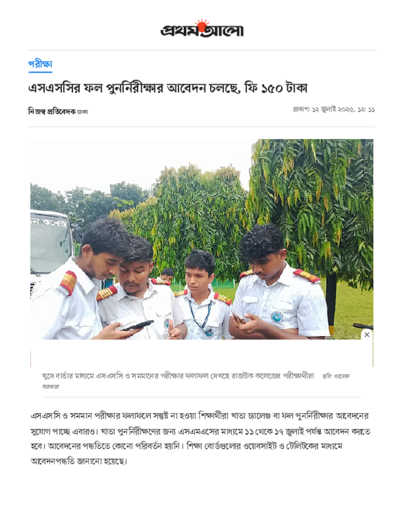 এসএসসির ফল পুনর্নিরীক্ষার আবেদন চলছে, ফি ১৫০ টাকা.pdf Published on 12 July 2025 Newspaper দৈনিক প্রথম আলো Category Public Examination Public Examination SSC Download
