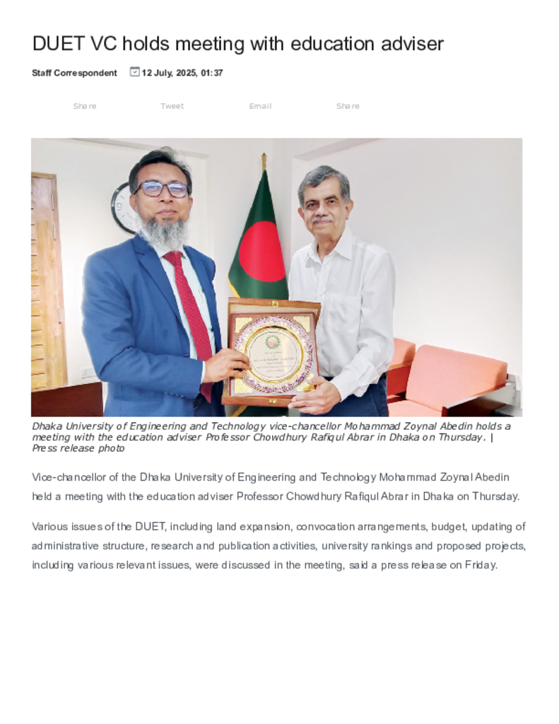 New Age _ DUET VC holds meeting with education adviser.pdf Published on 12 July 2025 Newspaper New Age Category Others General Education Download