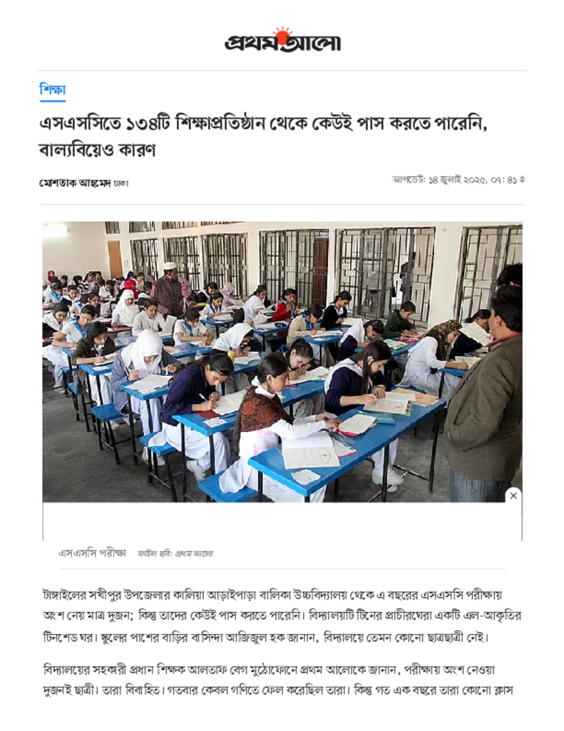 এসএসসিতে ১৩৪টি শিক্ষাপ্রতিষ্ঠান থেকে কেউই পাস করতে পারেনি, বাল্যবিয়েও কারণ.pdf Published on 14 July 2025 Newspaper দৈনিক প্রথম আলো Category Personal Opinion / Discussion / Commentary Public Examination SSC Download