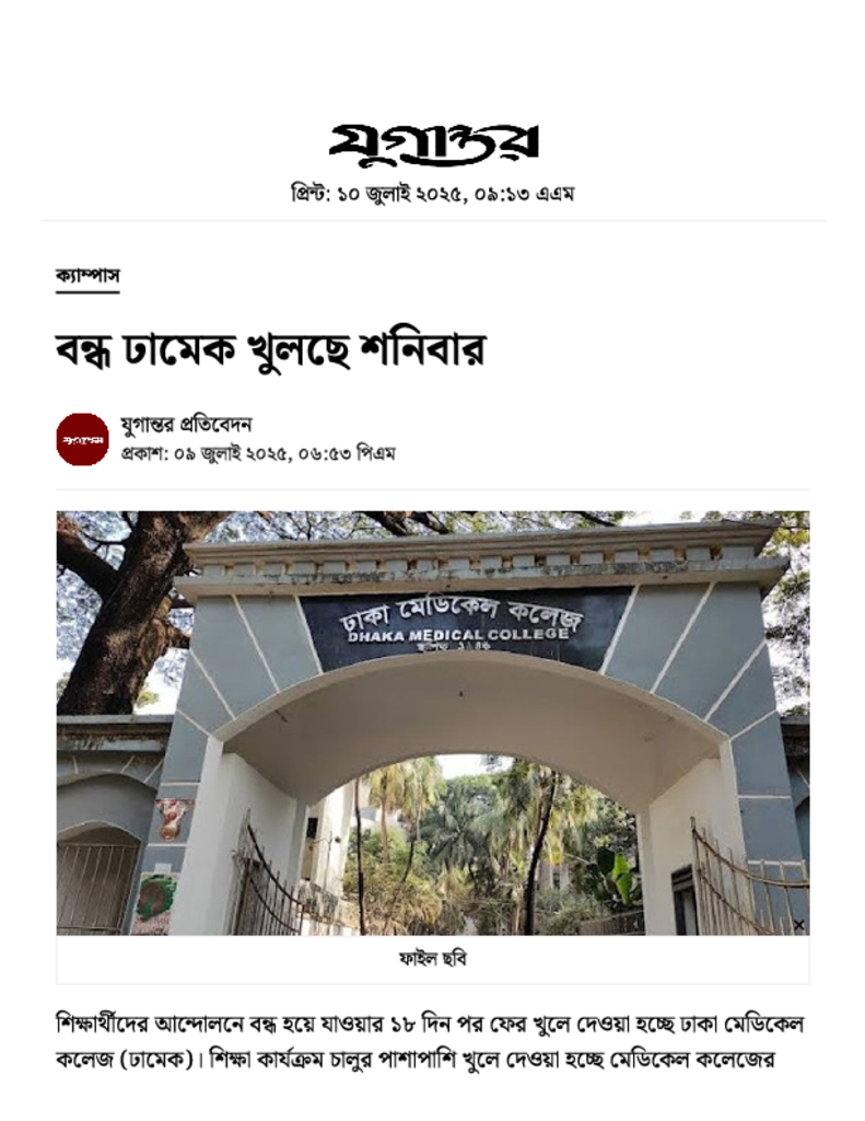 বন্ধ ঢামেক খুলছে শনিবার.pdf Published on 09 July 2025 Newspaper দৈনিক যুগান্তর Category Professional Education Professional Education Medical Download