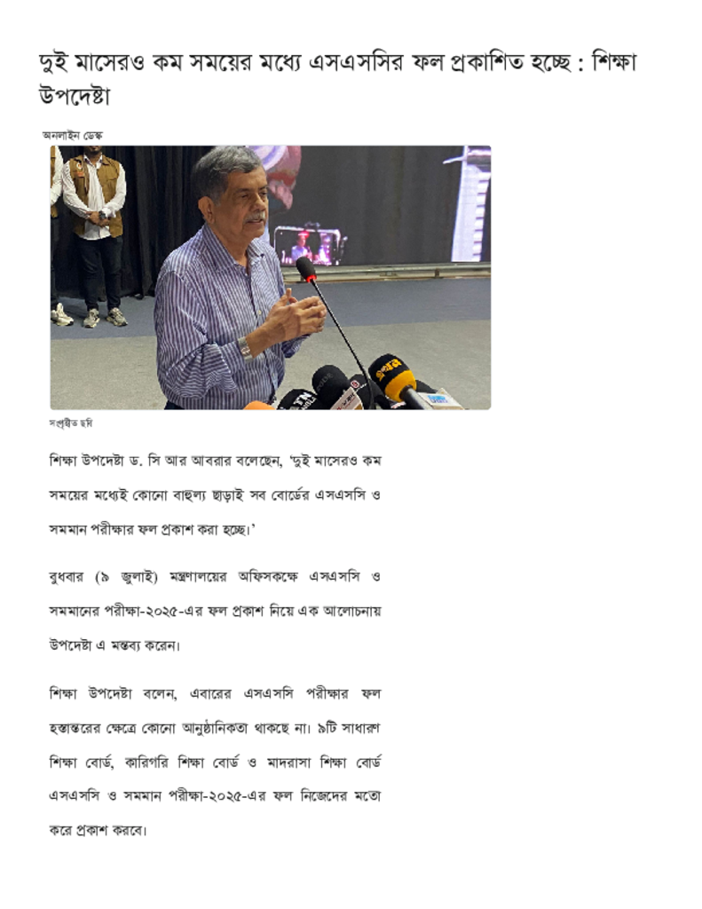 দুই মাসেরও কম সময়ের মধ্যে এসএসসির ফল প্রকাশিত হচ্ছে _ শিক্ষা উপদেষ্টা.pdf Published on 09 July 2025 Newspaper দৈনিক কালের কন্ঠ Category Public Examination Public Examination SSC Download