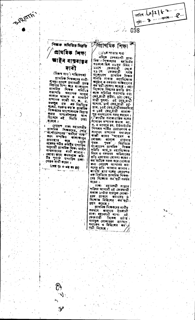 প্রাতমিক শিক্ষা আইন বাস্তবায়ন দাবী Published on Newspaper দৈনিক সংবাদ Category General Education Download