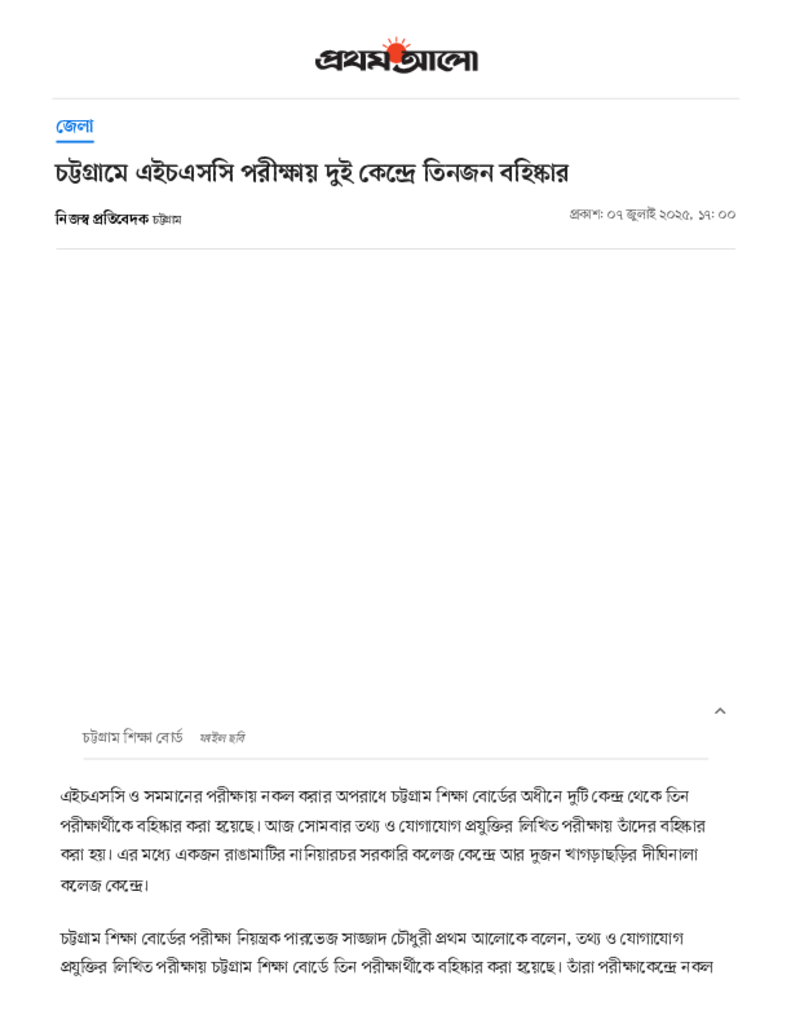 চট্টগ্রামে এইচএসসি পরীক্ষায় দুই কেন্দ্রে তিনজন বহিষ্কার _ প্রথম আলো.pdf Published on 07 July 2025 Newspaper দৈনিক প্রথম আলো Category Public Examination Public Examination HSC Download