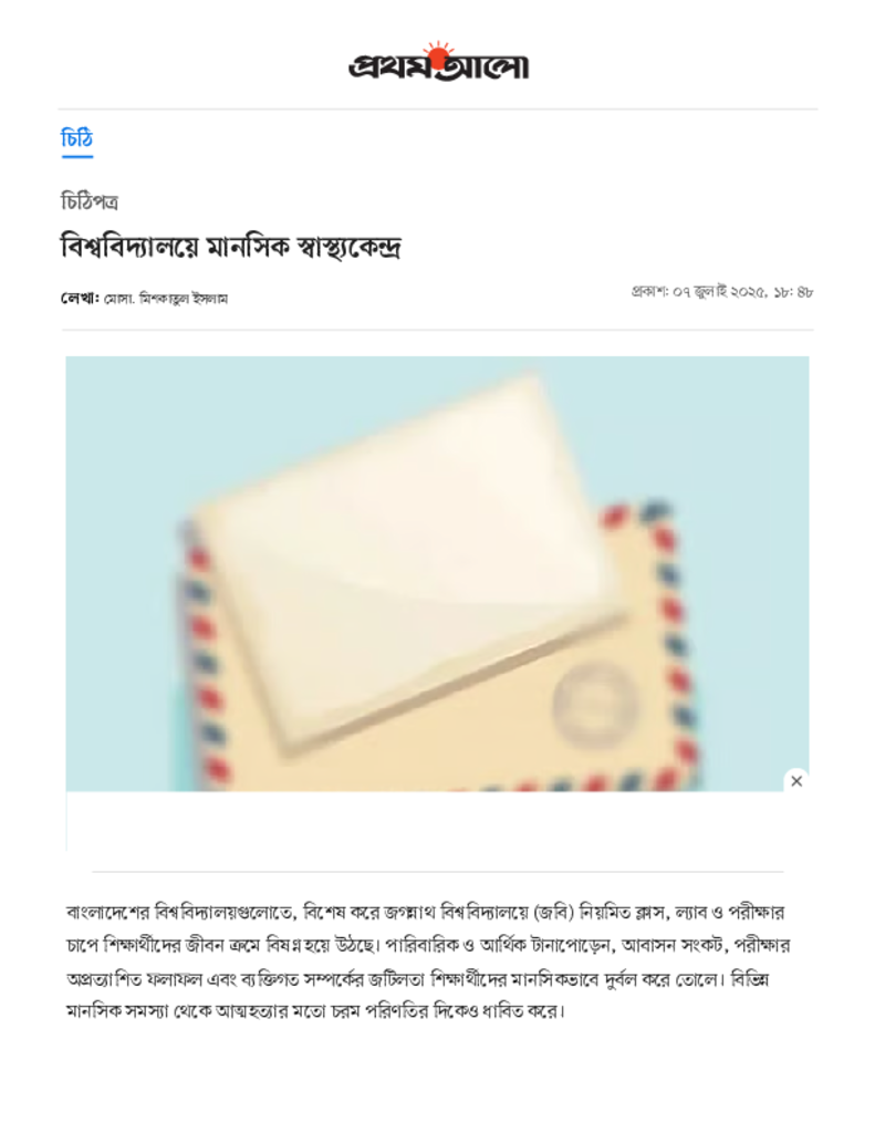 বিশ্ববিদ্যালয়ে মানসিক স্বাস্থ্যকেন্দ্র.pdf Published on 07 July 2025 Newspaper দৈনিক প্রথম আলো Category Personal Opinion / Discussion / Commentary General Education Download
