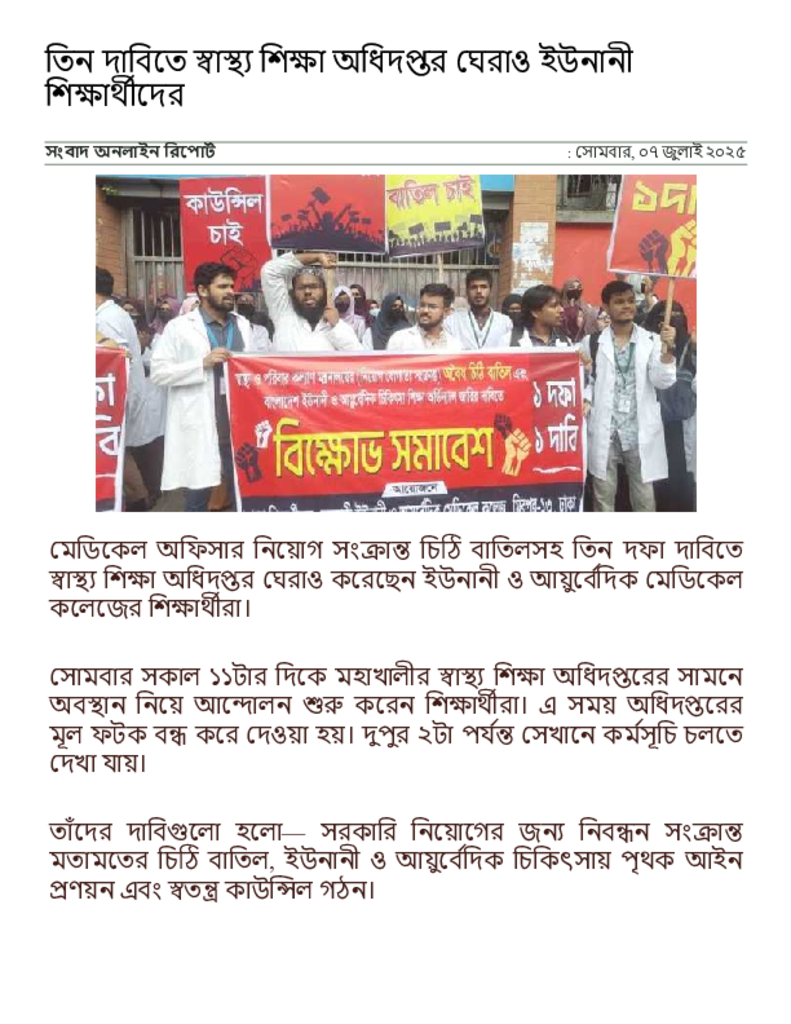 তিন দাবিতে স্বাস্থ্য শিক্ষা অধিদপ্তর ঘেরাও ইউনানী শিক্ষার্থীদের _ সংবাদ অনলাইন.pdf Published on 07 July 2025 Newspaper দৈনিক সংবাদ Category Professional Education Professional Education Medical Download