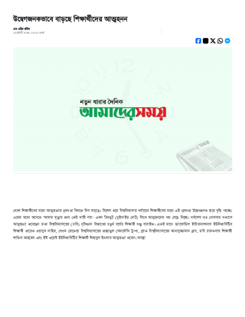 উদ্বেগজনকভাবে বাড়ছে শিক্ষার্থীদের আত্মহনন.pdf Published on 16 July 2025 Newspaper দৈনিক আমাদের সময় Category Personal Opinion / Discussion / Commentary Download