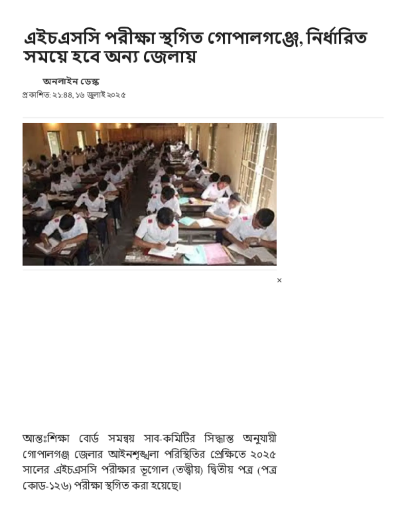 এইচএসসি পরীক্ষা স্থগিত গোপালগঞ্জে, নির্ধারিত সময়ে হবে অন্য জেলায়.pdf Published on 16 July 2025 Newspaper দৈনিক জনকণ্ঠ Category Educational Ministry / Departments Public Examination HSC Download
