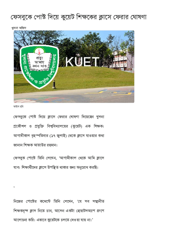ফেসবুকে পোস্ট দিয়ে কুয়েট শিক্ষকের ক্লাসে ফেরার ঘোষণা.pdf Published on 16 July 2025 Newspaper দৈনিক কালের কন্ঠ Category Professional Education General Education Download